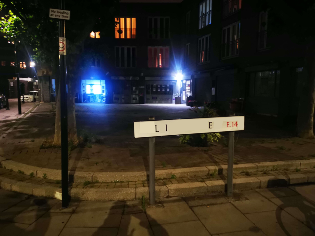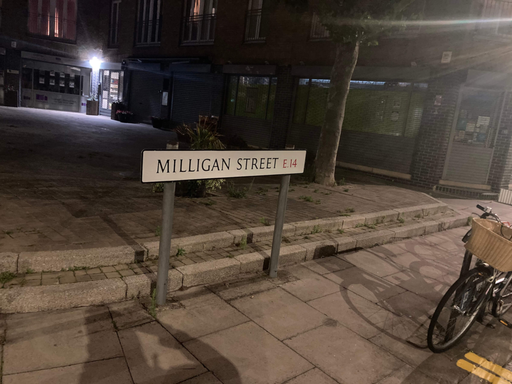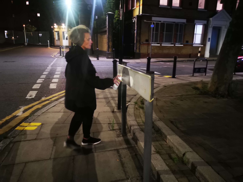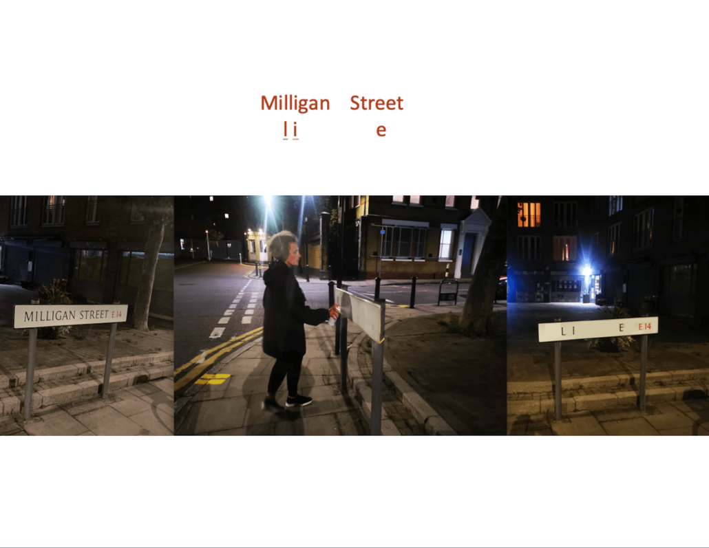 Milligan Street is 100m from Limehouse foreshore. The street name is intended to honour Robert Milligan, a noted slaveholder. In May 2020, responding to the Black Lives Matter protests, I made a work called LIE of the Land, in which I spray-painted out all the letters of Milligan Street apart from L I E.