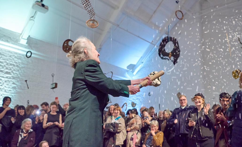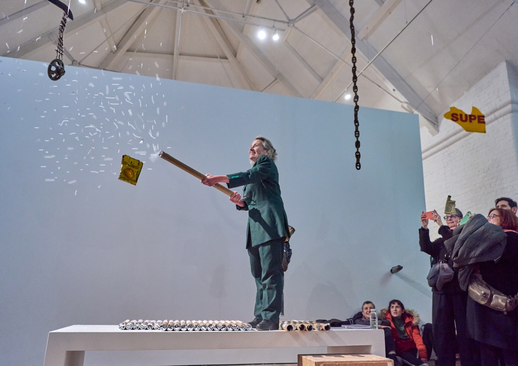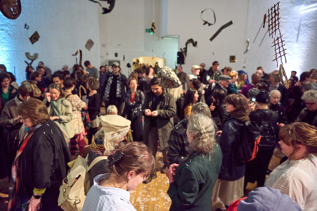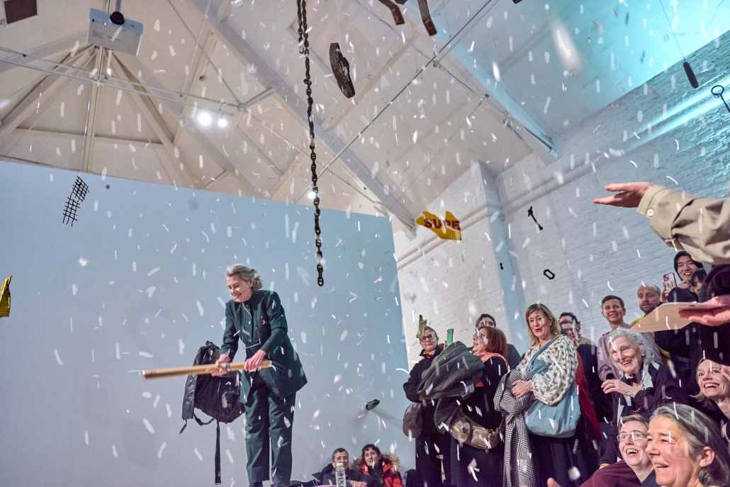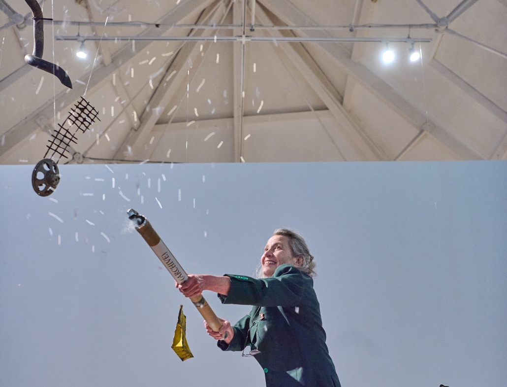 I met Barbara in the 70’s and developed a more in depth relationship with her in the 80’s during the setting up of a Bow Gamelan Ensemble performance, Offshore Rig, at Lots Ait, an island on the Thames. We invited the poet/percussionist Z’EV to take part. Later Barbara made the film ‘I Find myself,’ with him which is the title of the exhibition. Barbara was searching for her more personal voice outside of Artist Placement Group and Organisation and Imagination. Her work titled ‘Beyond the acid free’ at Arnolfini, 2009, used a shredder on her archival material. For me this freed her archives from its regimented and stable order into a new dynamic ordered disorder, full of chance and poetry. Thinking of Barbara’s love of the Bow Gamelan Ensemble’s work, which had an intense raw and visceral physicality and these shredded fragments of different texts, I conceived a work in which shredded photocopies of her archives were explosively distributed amongst the audience from compressed air cannons. The audience were showered with fragments of her archives, becoming a collective of Barbara’s visions.